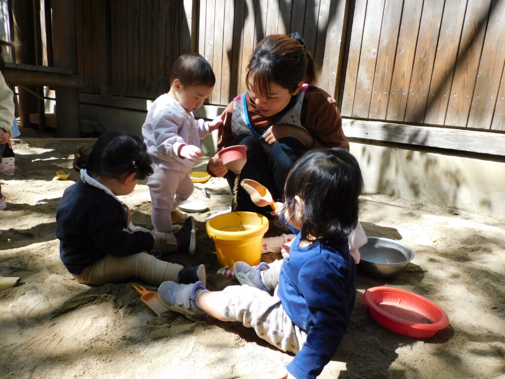 ひよこ組の戸外あそびの様子です。新入園児の子も少しずつ園生活に慣れてきて、気になるあそびを見つけて楽しめるようになってきました。 -